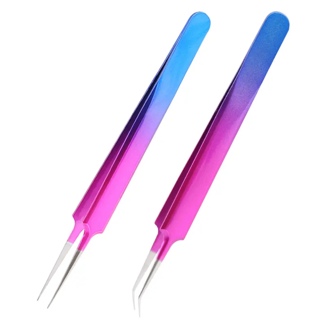 CONTEM UM PAR DE PINÇAS DE ALTA PRECISAO PARA CILIOS, FEITAS DE AÇO INOXIDAVEL