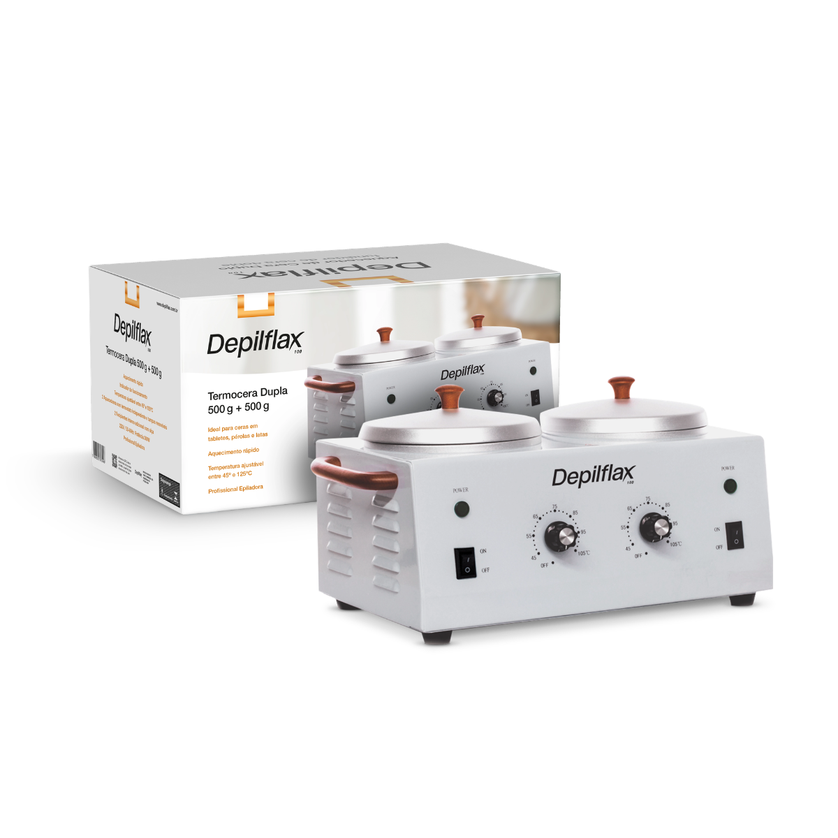 Atributos (da caixa): Ideal para ceras em tabletes, pérolas e latas; Aquecimento rápido; Temperatura ajustável entre 45° e 125°C; Indicador de funcionamento; 02 Aquecedores com termostato independente e tampas removíveis.